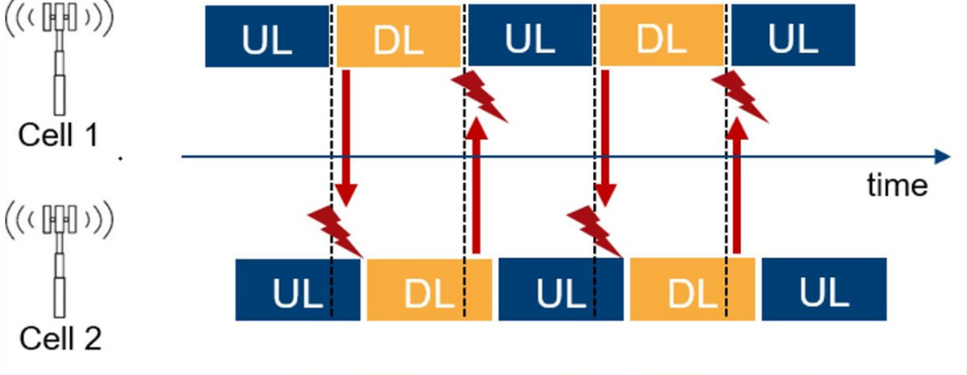 Mobiele 5G netwerken maken gebruik van de Time Division Duplex techniek. Hierbij zendt een basisstation enige tijd op één frequentie (het oranje blokje in de onderstaande afbeelding) en daarna zendt het mobieltje op dezelfde frequentie (het blauwe blokje). Als de timing tussen basisstations niet correct is zal de communicatie tussen basisstation en mobieltje verstoord worden. Als het onderlinge timingsverschil te groot wordt kan de communicatie zelfs geheel onmogelijk worden.